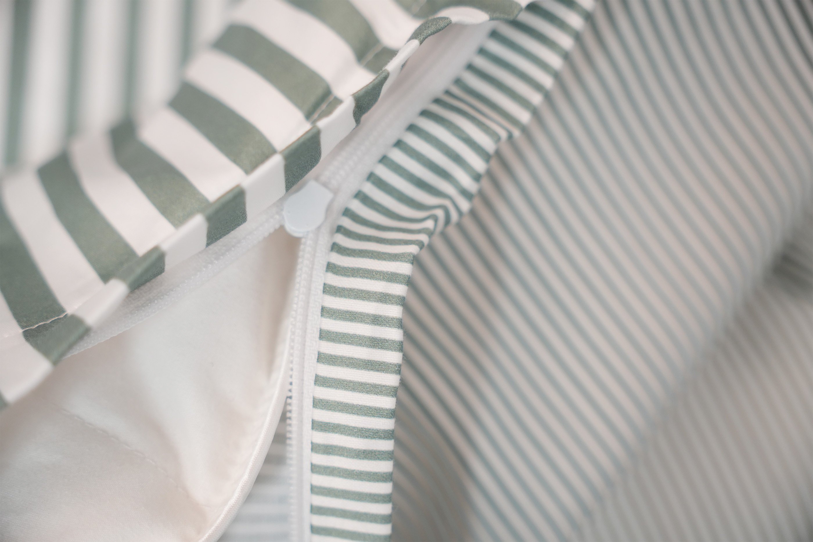 Pudebetræk lukkes med flaplukning og dynebetræk lukkes med lynlås.